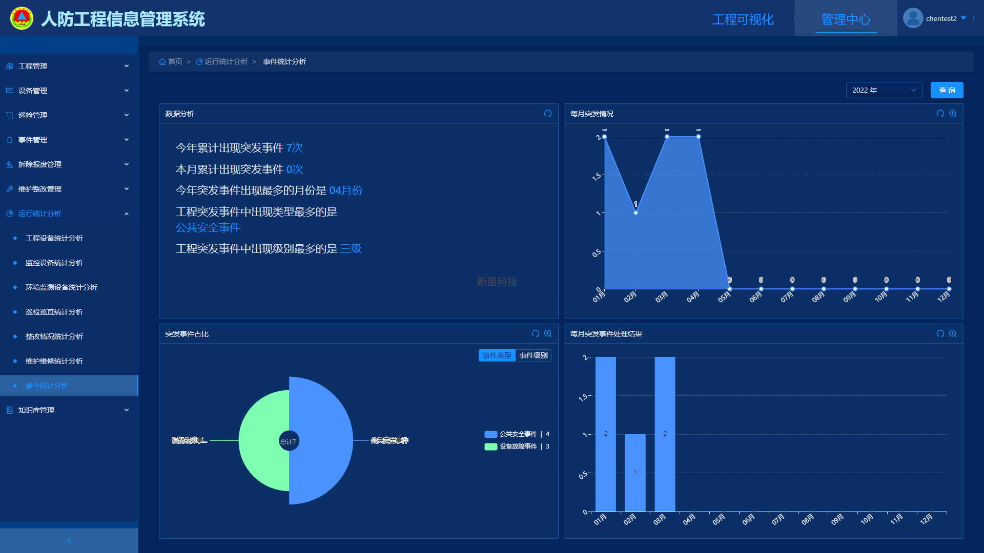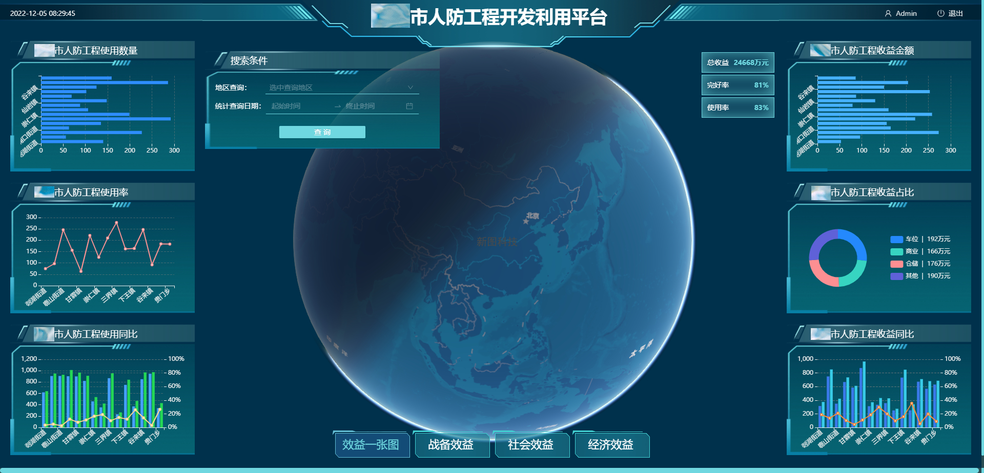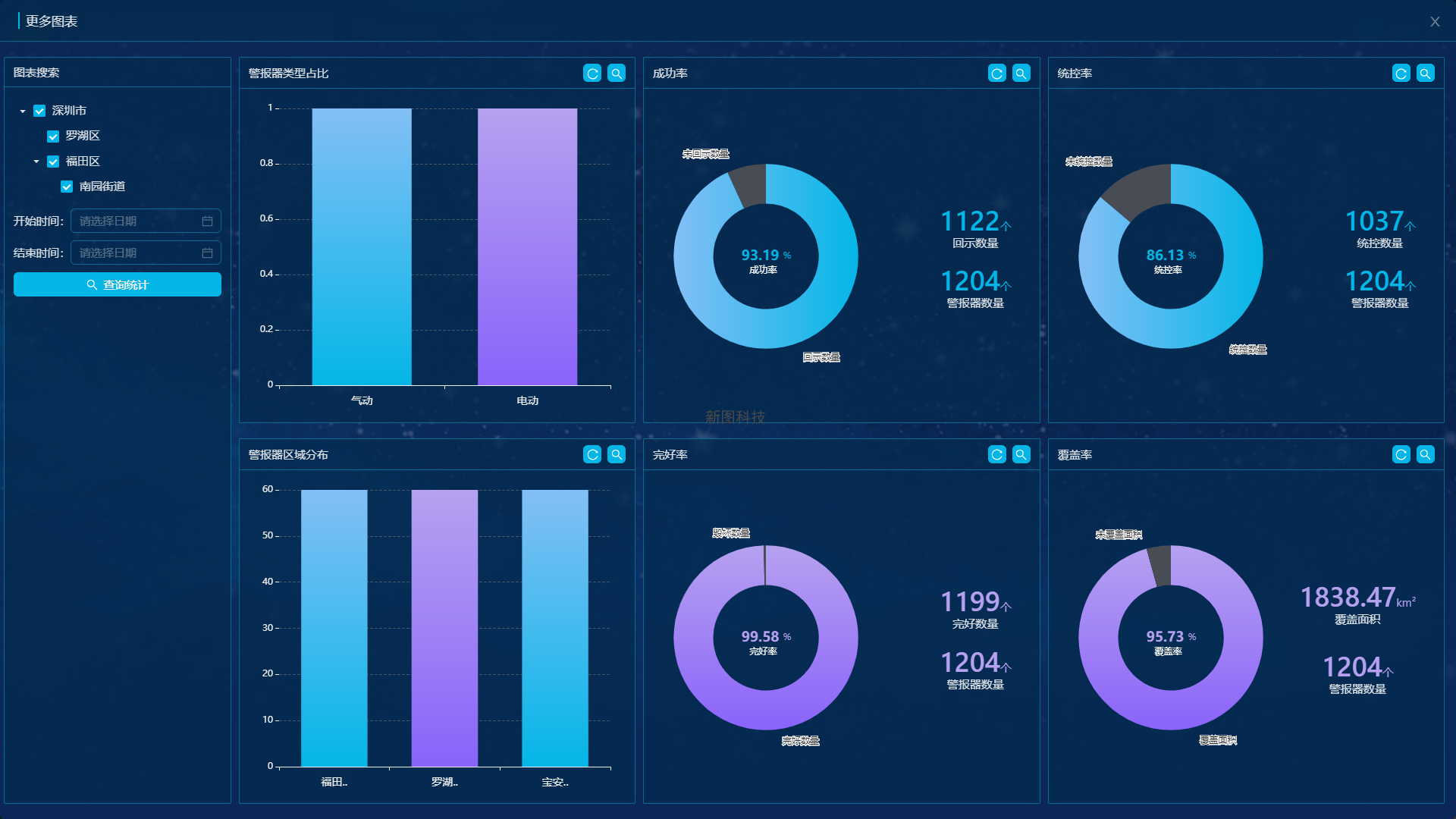 系统实现了运行态势可视化。基于系统各类数据,综合利用GIS、卫星定位、可视化图表等技术,通过专题图和地图相结合的方式,以丰富的图形化、动态化展示效果,综合展示防空警报系统的整体运行情况和空间分布状况,构建人防警报系统“业务中台”。